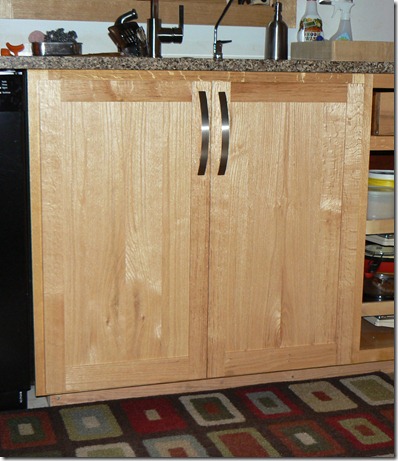 The three doors to the left of the microwave cabinet came out quite well. A measuring/mental math error when making the cabinet’s face frame made me fear I’d need to make the doors different sizes to keep the spacing between them consistent. By using hinges with different offsets on each door I was able to work around the problem. I’ve got to say I’m rather pleased with the result.